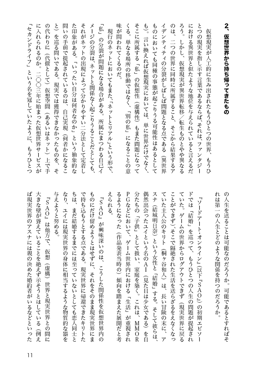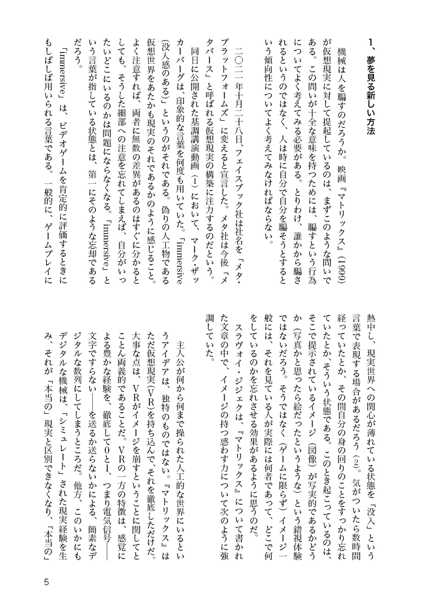 仮想現実は発展途上の技術である。「メタバース」という言葉を巡る昨今の過熱した状況も、「未来」の名の下に「現実」を括弧に入れることができるがゆえに――この空白から無数の空想を引き出せるがゆえに――引き起こされた事態という印象を抱く。仮想現実を描いてきたフィクションは、具体的かつ詳細なイメージを提供してきたという点で、そうした過剰な期待を醸成する役割を果たしてきただろう。